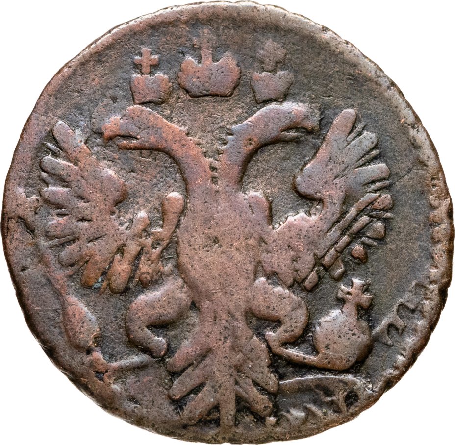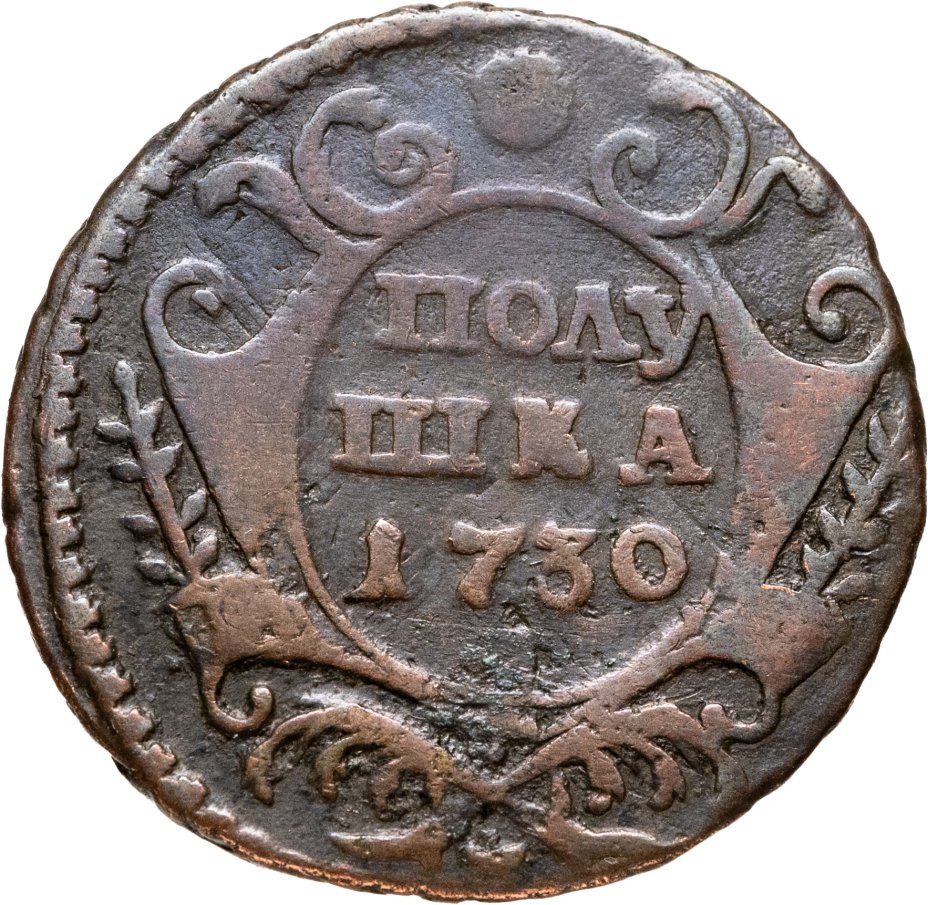 В центре изображён картуш украшенный виньетками, по обеим сторонам две лавровые ветви, сверху - цветочная розетка. Под картушем - две перекрещенные пальмовые ветви с обвязкой (бантом). В картуше надпись в три строки, в которой указан номинал и год выпуска: «ПОЛУ»│«ШКА»│«1730».