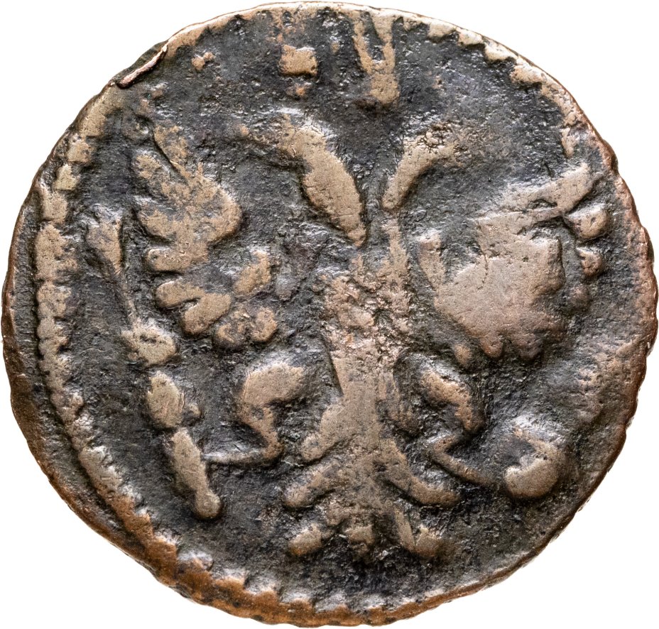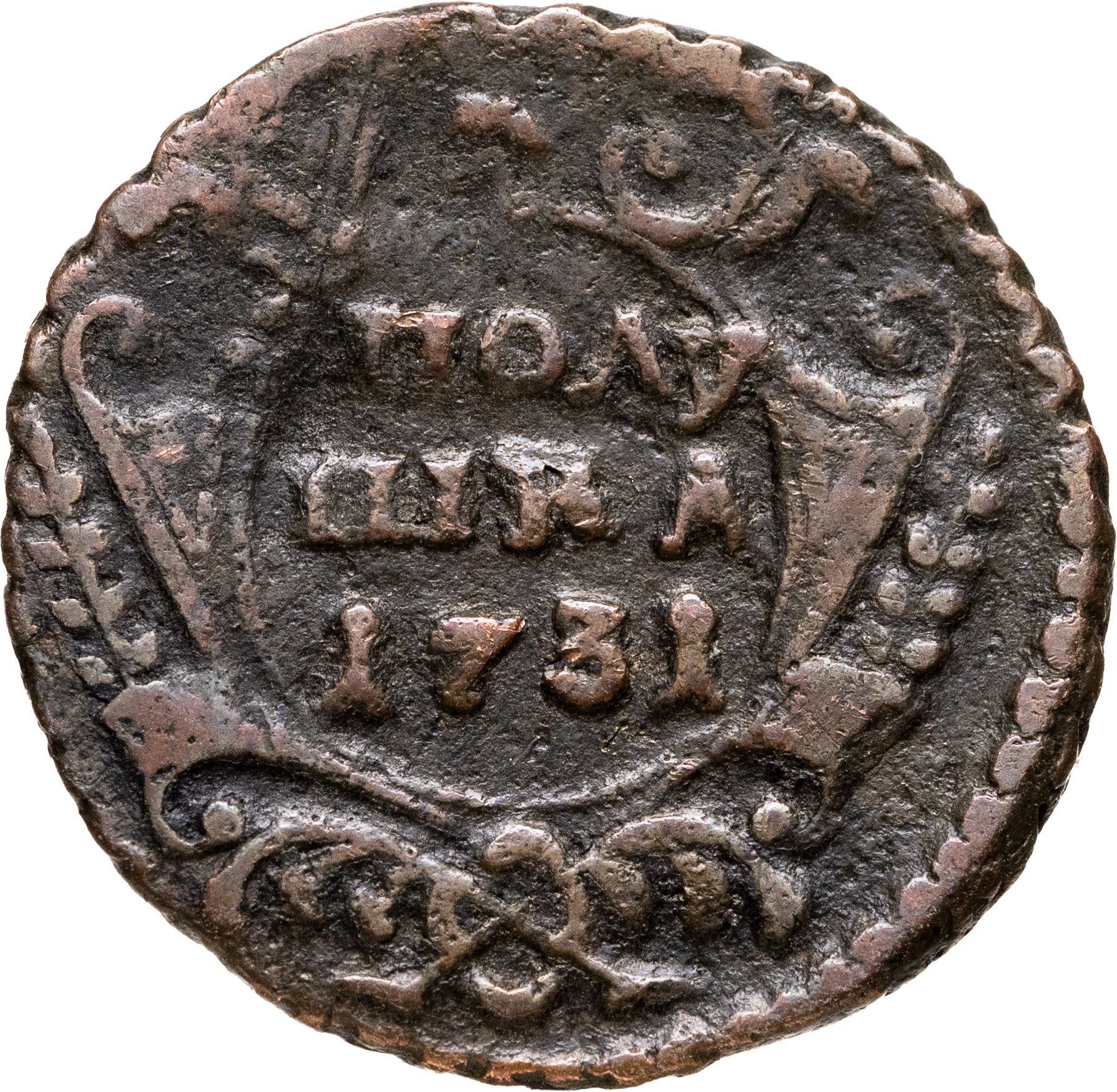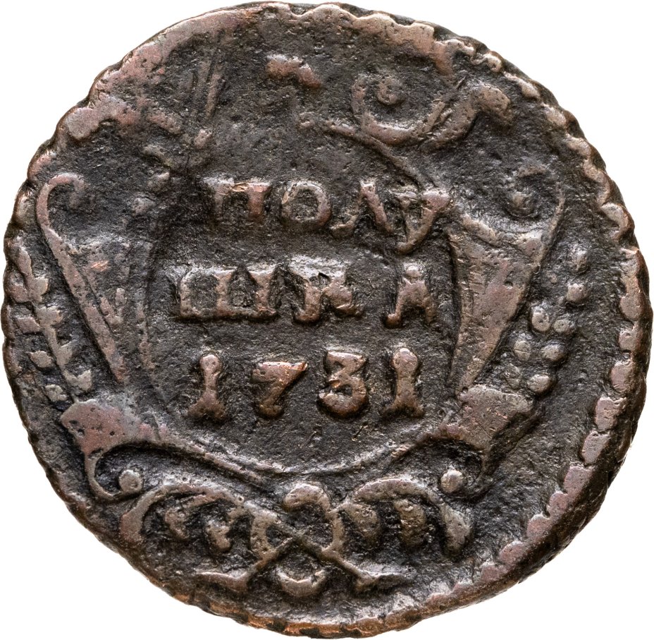 В центре изображён картуш украшенный виньетками, по обеим сторонам две лавровые ветви, сверху - цветочная розетка. Под картушем - две перекрещенные пальмовые ветви с обвязкой (бантом). В картуше надпись в три строки, в которой указан номинал и год выпуска: «ПОЛУ»│«ШКА»│«1731».