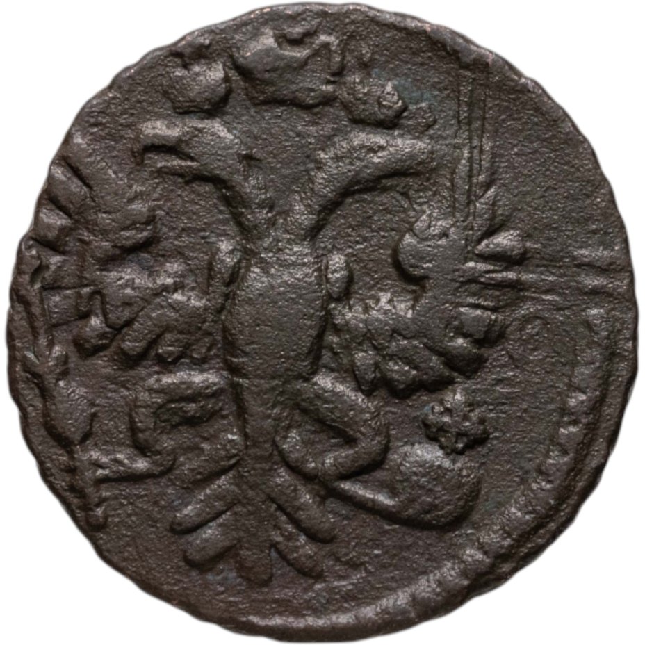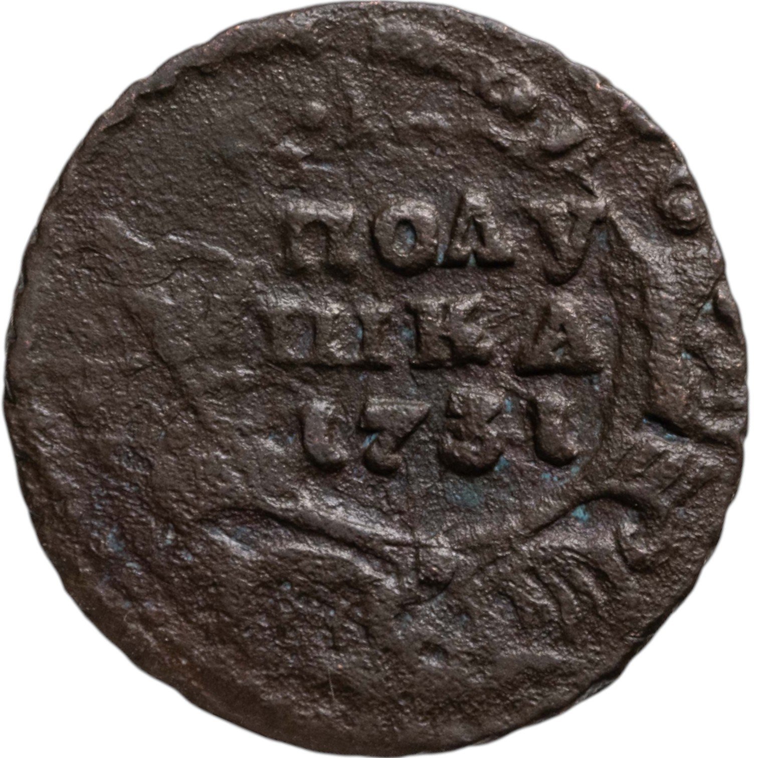 В центре изображён картуш украшенный виньетками, по обеим сторонам две лавровые ветви, сверху - цветочная розетка. Под картушем - две перекрещенные пальмовые ветви с обвязкой (бантом). В картуше надпись в три строки, в которой указан номинал и год выпуска: «ПОЛУ»│«ШКА»│«1731».