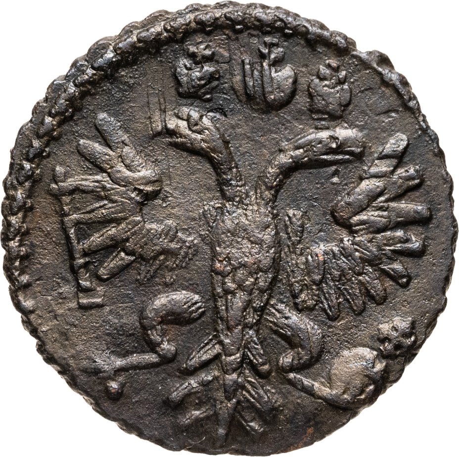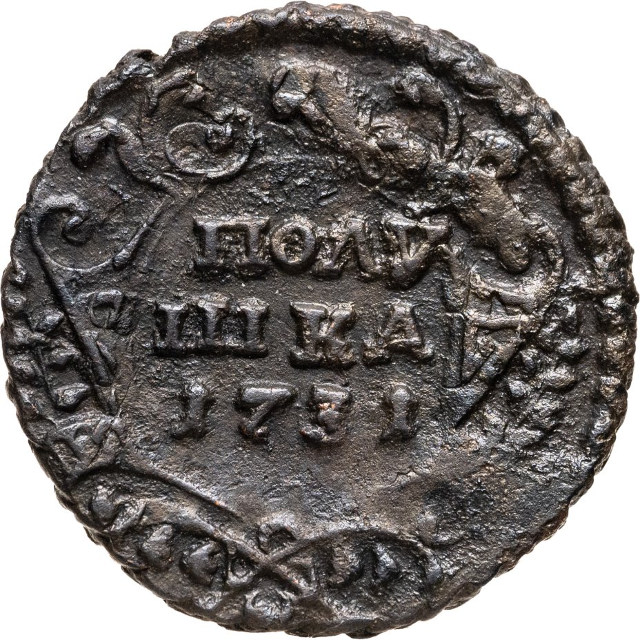 В центре изображён картуш украшенный виньетками, по обеим сторонам две лавровые ветви, сверху - цветочная розетка. Под картушем - две перекрещенные пальмовые ветви с обвязкой (бантом). В картуше надпись в три строки, в которой указан номинал и год выпуска: «ПОЛУ»│«ШКА»│«1731».