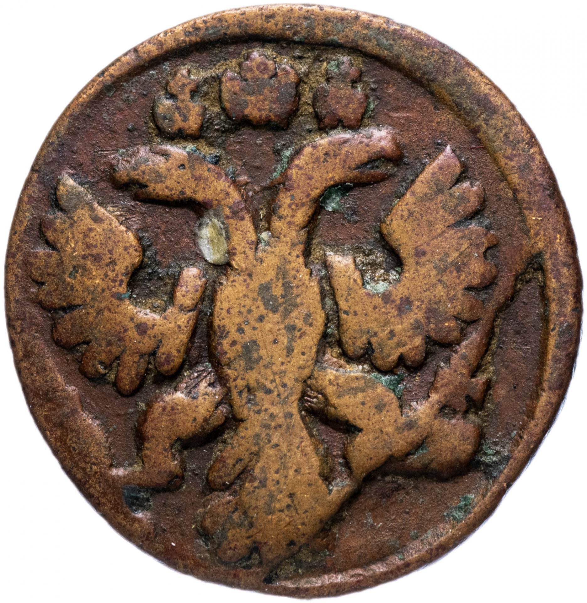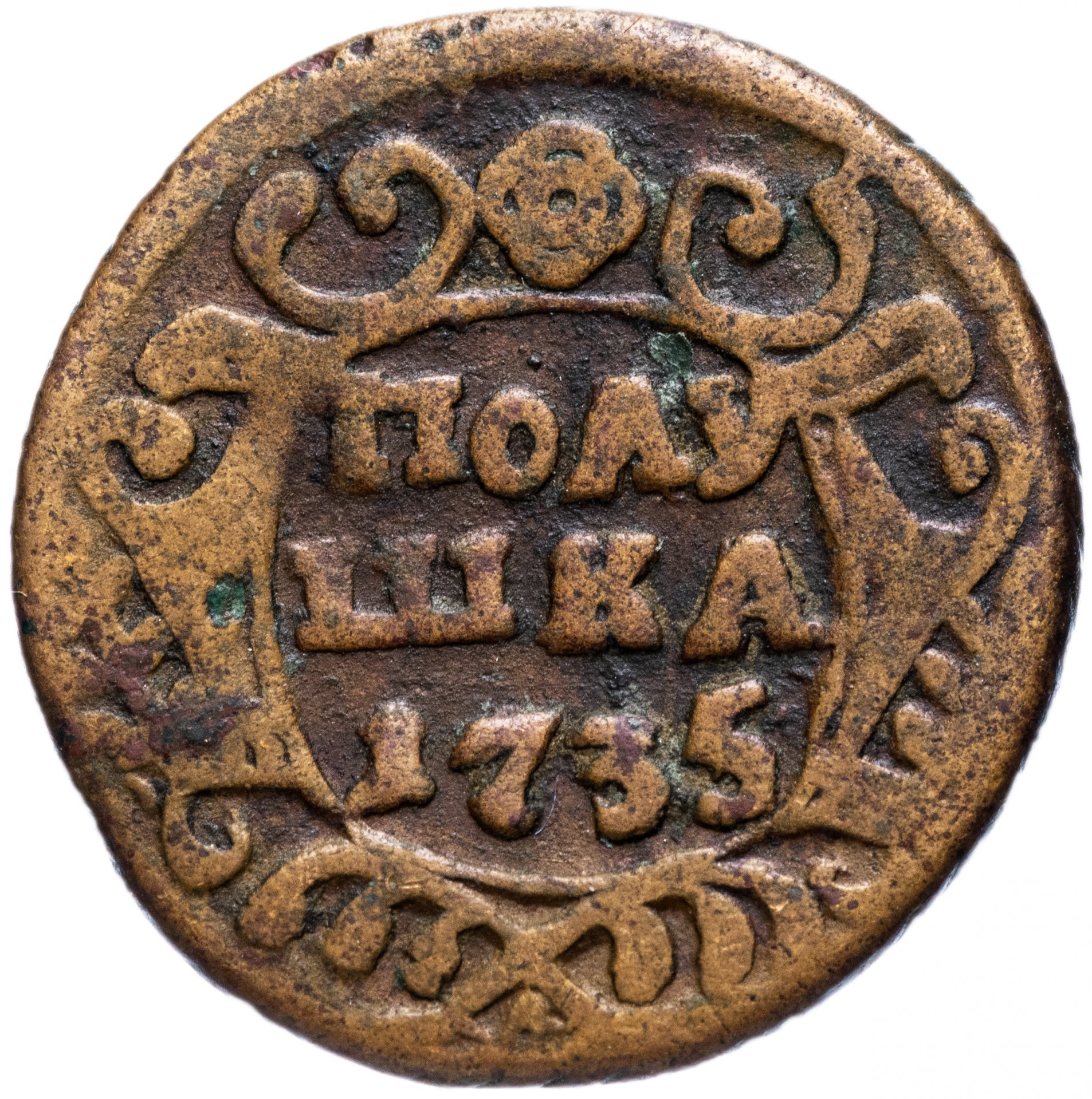 В центре изображён картуш украшенный виньетками, по обеим сторонам две лавровые ветви, сверху - цветочная розетка. Под картушем - две перекрещенные пальмовые ветви с обвязкой (бантом). В картуше надпись в три строки, в которой указан номинал и год выпуска: «ПОЛУ»│«ШКА»│«1735».