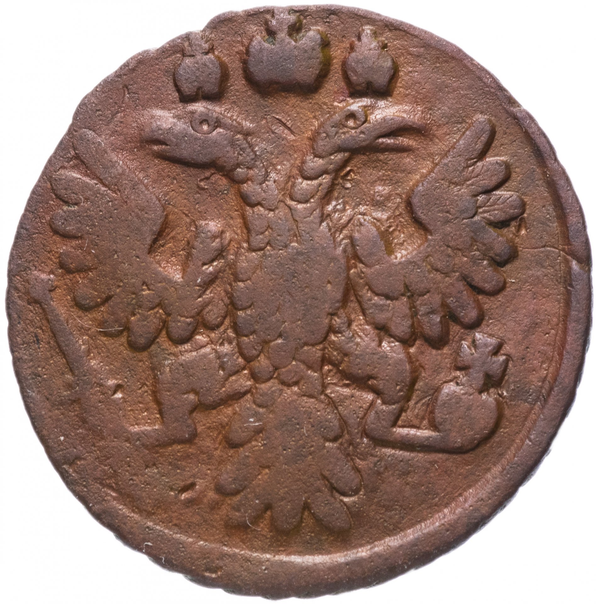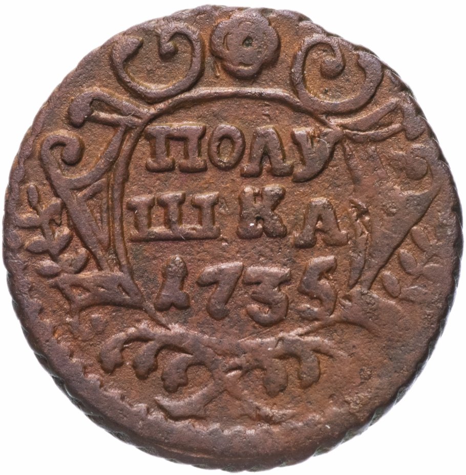 В центре изображён картуш украшенный виньетками, по обеим сторонам две лавровые ветви, сверху - цветочная розетка. Под картушем - две перекрещенные пальмовые ветви с обвязкой (бантом). В картуше надпись в три строки, в которой указан номинал и год выпуска: «ПОЛУ»│«ШКА»│«1735».