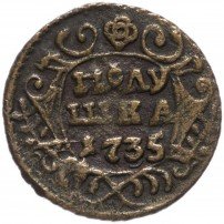 В центре изображён картуш украшенный виньетками, по обеим сторонам две лавровые ветви, сверху - цветочная розетка. Под картушем - две перекрещенные пальмовые ветви с обвязкой (бантом). В картуше надпись в три строки, в которой указан номинал и год выпуска: «ПОЛУ»│«ШКА»│«1735».