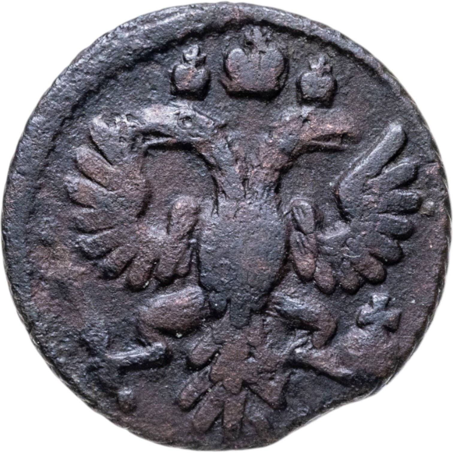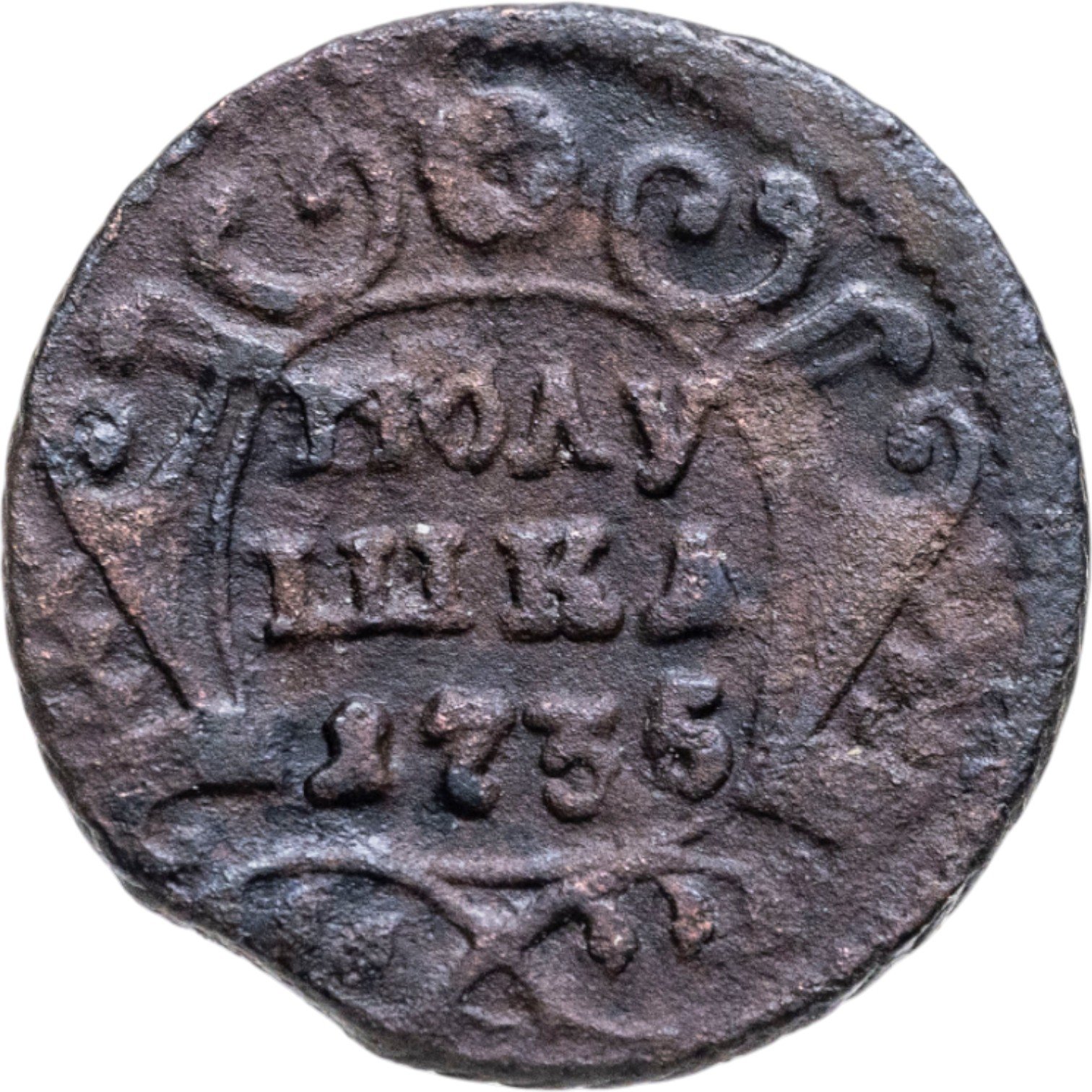 В центре изображён картуш украшенный виньетками, по обеим сторонам две лавровые ветви, сверху - цветочная розетка. Под картушем - две перекрещенные пальмовые ветви с обвязкой (бантом). В картуше надпись в три строки, в которой указан номинал и год выпуска: «ПОЛУ»│«ШКА»│«1735».