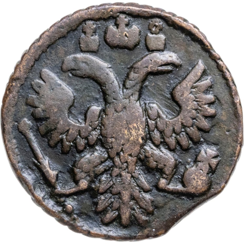 В центре изображён картуш украшенный виньетками, по обеим сторонам две лавровые ветви, сверху - цветочная розетка. Под картушем - две перекрещенные пальмовые ветви с обвязкой (бантом). В картуше надпись в три строки, в которой указан номинал и год выпуска: «ПОЛУ»│«ШКА»│«1735».