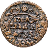 В центре изображён картуш украшенный виньетками, по обеим сторонам две лавровые ветви, сверху - цветочная розетка. Под картушем - две перекрещенные пальмовые ветви с обвязкой (бантом). В картуше надпись в три строки, в которой указан номинал и год выпуска: «ПОЛУ»│«ШКА»│«1735».