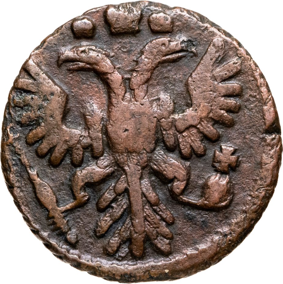 В центре изображён картуш украшенный виньетками, по обеим сторонам две лавровые ветви, сверху - цветочная розетка. Под картушем - две перекрещенные пальмовые ветви с обвязкой (бантом). В картуше надпись в три строки, в которой указан номинал и год выпуска: «ПОЛУ»│«ШКА»│«1735».