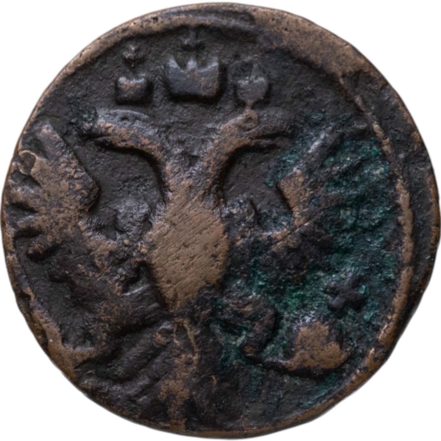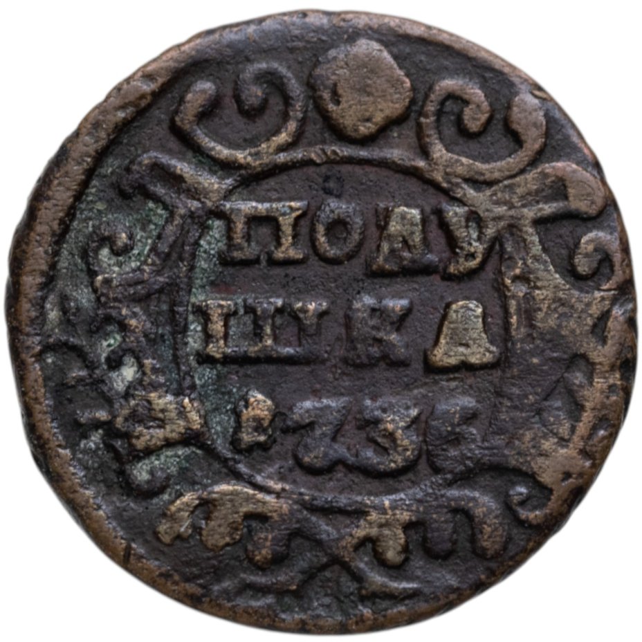 В центре изображён картуш украшенный виньетками, по обеим сторонам две лавровые ветви, сверху - цветочная розетка. Под картушем - две перекрещенные пальмовые ветви с обвязкой (бантом). В картуше надпись в три строки, в которой указан номинал и год выпуска: «ПОЛУ»│«ШКА»│«1736».