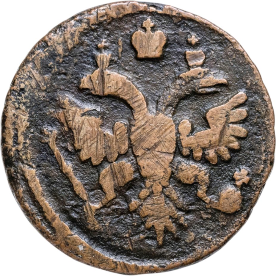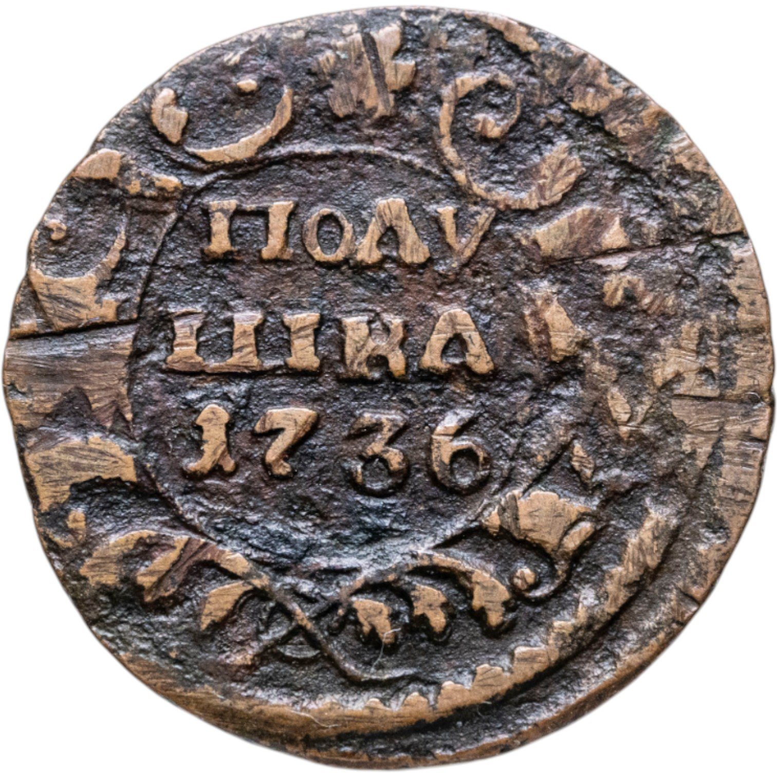 В центре изображён картуш украшенный виньетками, по обеим сторонам две лавровые ветви, сверху - цветочная розетка. Под картушем - две перекрещенные пальмовые ветви с обвязкой (бантом). В картуше надпись в три строки, в которой указан номинал и год выпуска: «ПОЛУ»│«ШКА»│«1736».