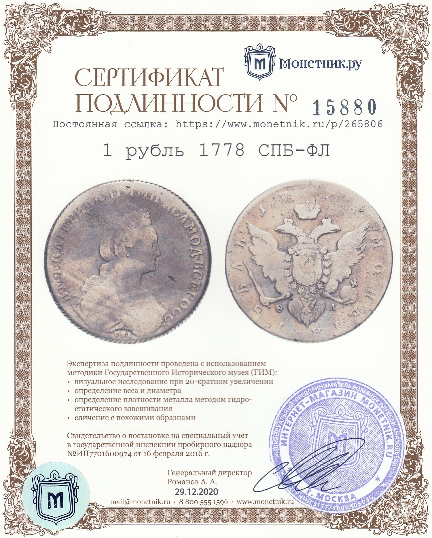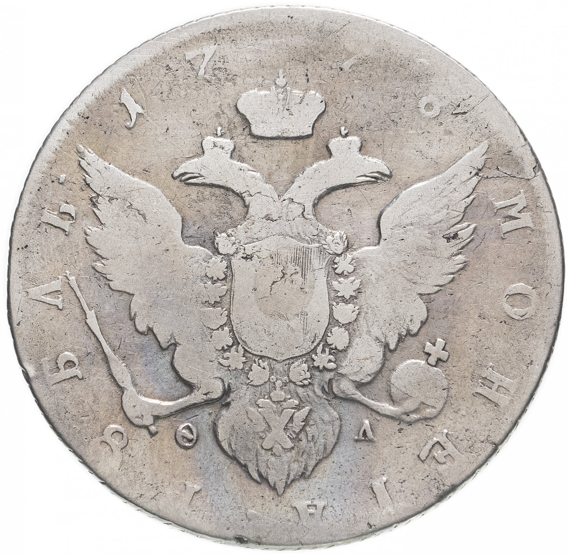 В центре изображен Государственный Герб Российской империи - двуглавый орёл, головы которого увенчаны двумя коронами, третья, большая корона над ними. На груди орла расположен Московский герб - щит с изображением Георгия Победоносца, поражающего копьем дракона. Вокруг щита орденская цепь с орденом Св. Апостола Андрея Первозванного. В правой лапе орла – скипетр, в левой – держава. Под правой лапой – буква «Ф», под левой – буква «Л». Инициалы минцмейстера Фёдора Лесникова. Над орлом дата выпуска монеты – «1778». Вокруг орла, обращенная внутрь, надпись: «МОНЕТА•РУБЛЬ•». По окружности канта имеются рельефные элементы, выполненные в виде зубцов.