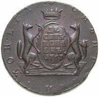 В центре изображен картуш с надписью в четыре строки: «ДЕ»│«СЯТЬ•»│«КОПЕ»│«ЕКЪ•», под надписью дата выпуска - «1767». Картуш, с обеих сторон, поддерживается двумя соболями. Над картушем - царская корона, над ней - четырёхлистная цветочная розетка. По окружности, вдоль канта, надпись: «•СИБИРСКАЯ•МОНЕТА•».