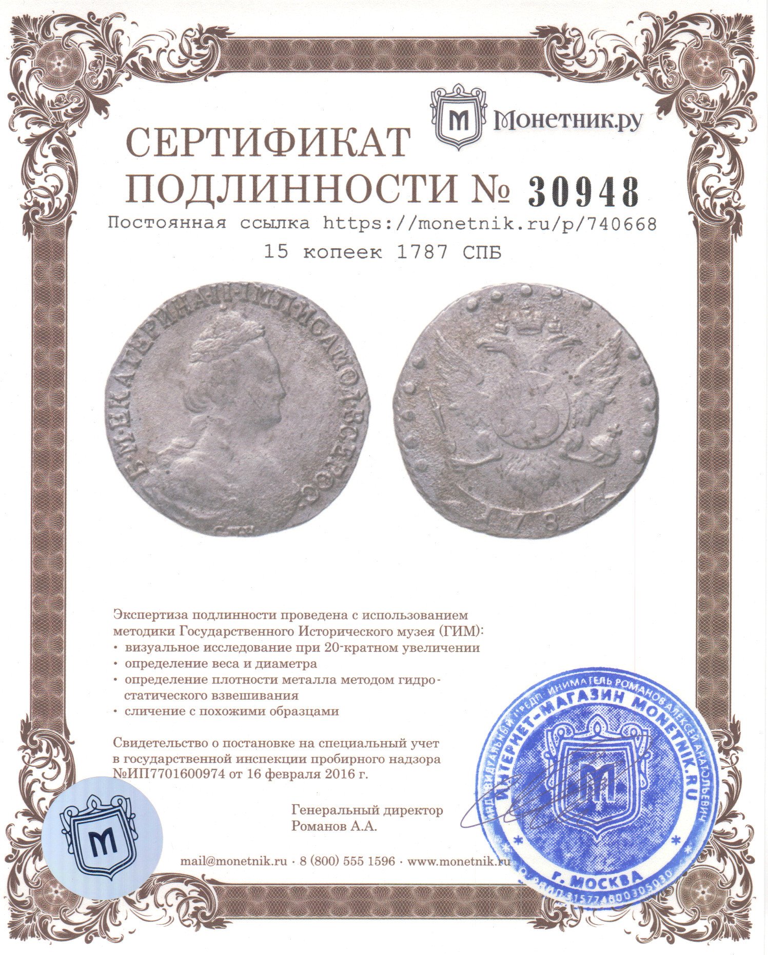 В центре изображен Государственный Герб Российской империи - двуглавый орёл, головы которого увенчаны двумя коронами, третья, большая корона над ними. В правой лапе орла – скипетр, в левой – держава. На груди орла щит с обозначением номинала - цифрой «15». Вокруг орла, вдоль канта, 15 счётных точек, разделённые на 3 группы по пять точек. Также обозначающие номинал монеты. Ниже орла, на стилизованной ленте, дата выпуска - «1787».