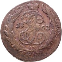 В центре изображён вензель Екатерины II. Над вензелем - императорская корона. По обеим сторонам от вензеля цифры даты выпуска монеты: слева - «17», справа - «63» (1763 год). Вокруг центрального изображения, вдоль канта, изображён венок из лавровой и пальмовой ветвей, которые, в нижней части, перевязаны лентой на узел бантом.