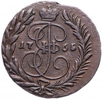 В центре изображён вензель Екатерины II. Над вензелем - императорская корона. По обеим сторонам от вензеля цифры даты выпуска монеты: слева - «17», справа - «65» (1765 год). Вокруг центрального изображения, вдоль канта, изображён венок из лавровой и пальмовой ветвей, которые, в нижней части, перевязаны лентой на узел бантом.
