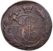В центре изображён вензель Екатерины II. Над вензелем - императорская корона. По обеим сторонам от вензеля цифры даты выпуска монеты: слева - «17», справа - «66» (1766 год). Вокруг центрального изображения, вдоль канта, изображён венок из лавровой и пальмовой ветвей, которые, в нижней части, перевязаны лентой на узел бантом.