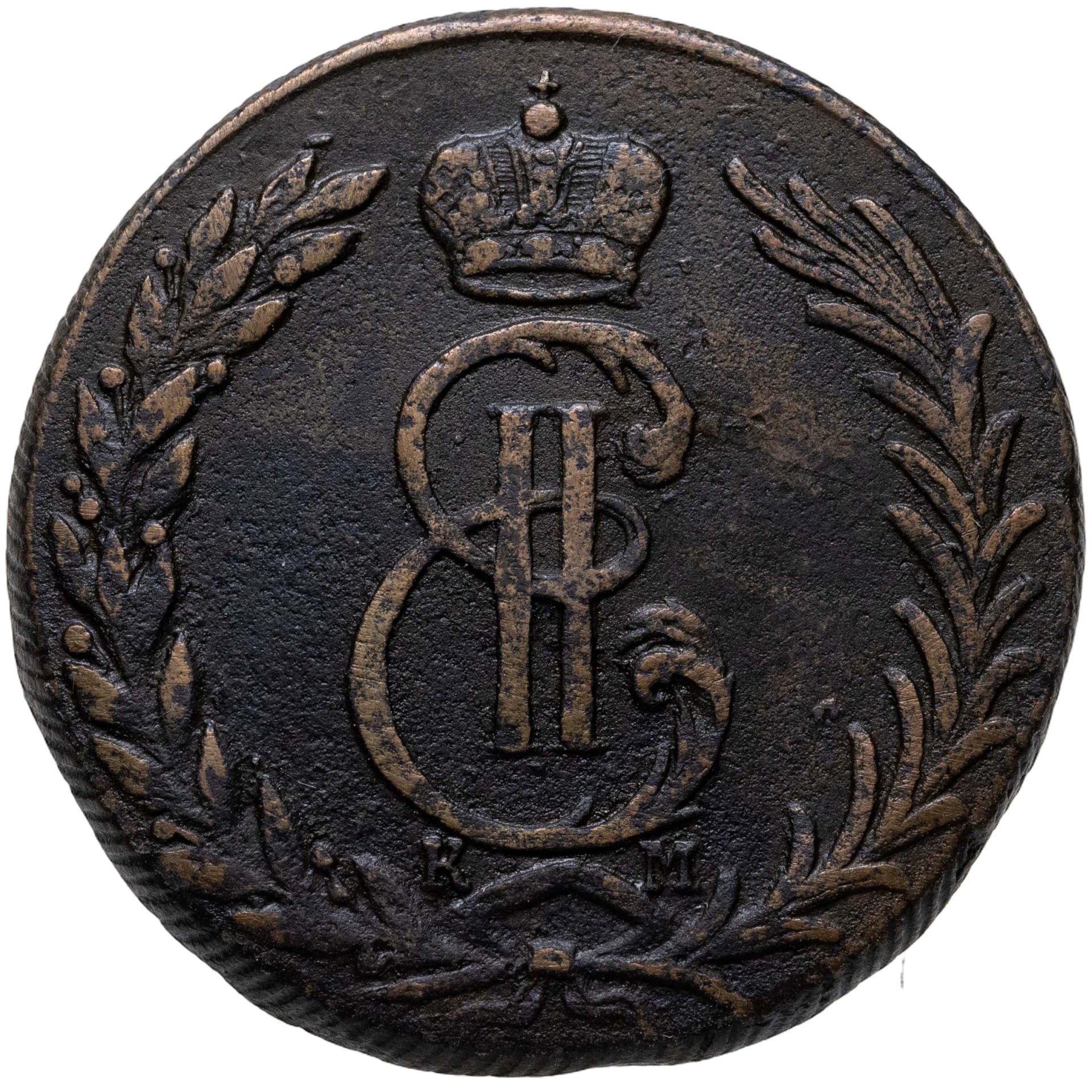 В центре - вензель Екатерины II. Над ним императорская корона. Под вензелем обозначение Сузунского монетного двора - буквы «К М». Вокруг центрального изображения, вдоль канта, изображён венок из лавровой и пальмовой ветвей, которые, в нижней части, перевязаны лентой на узел бантом.