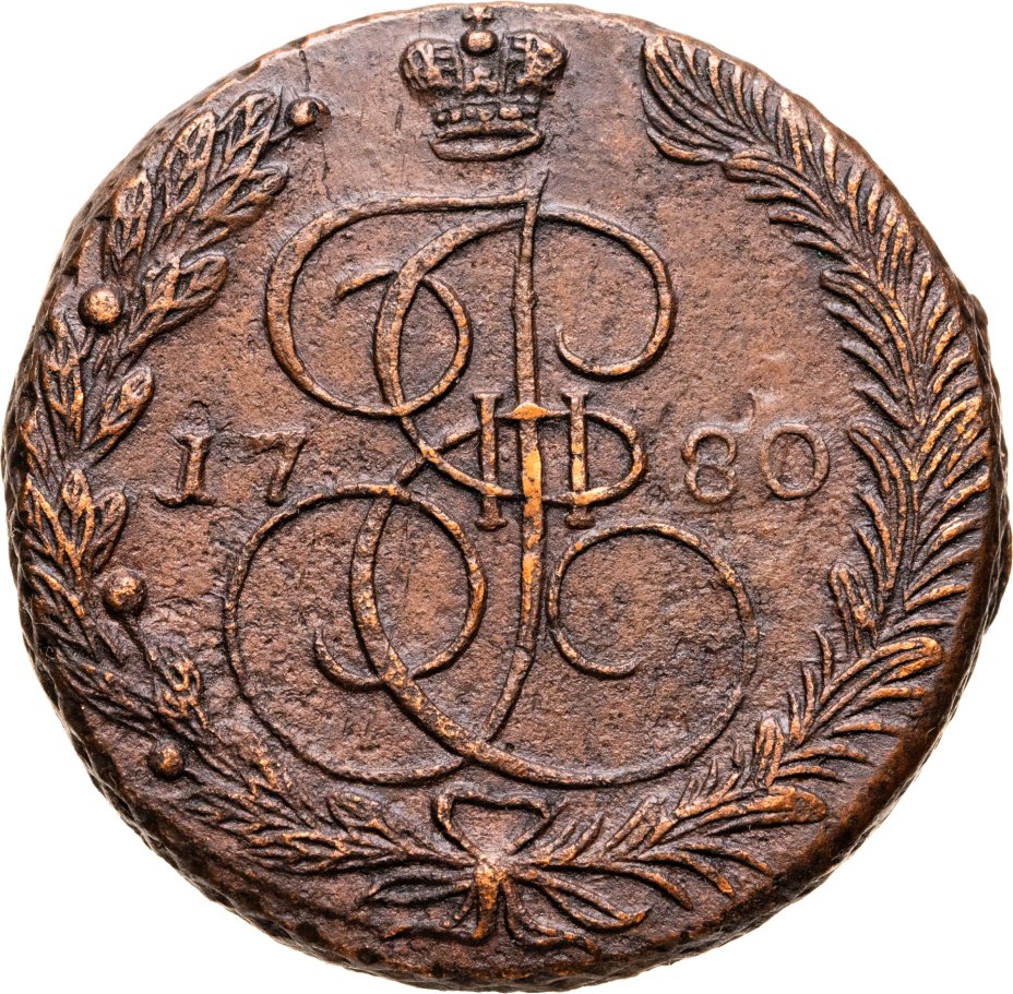 В центре изображён вензель Екатерины II. Над вензелем - императорская корона. По обеим сторонам от вензеля цифры даты выпуска монеты: слева - «17», справа - «80» (1780 год). Вокруг центрального изображения, вдоль канта, изображён венок из лавровой и пальмовой ветвей, которые, в нижней части, перевязаны лентой на узел бантом.