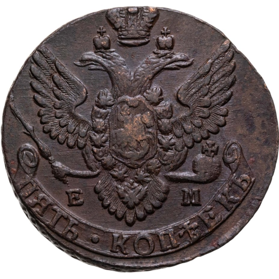 В центре изображен Государственный Герб Российской империи - двуглавый орёл с поднятыми вверх распущенными крыльями. Головы которого увенчаны двумя коронами, третья, большая корона над ними. На груди орла расположен Московский герб - щит с изображением Георгия Победоносца, поражающего копьём дракона. Вокруг щита орденская цепь с орденом Св. Апостола Андрея Первозванного. В правой лапе орла – скипетр, в левой – держава. Под правой лапой – буква «А», под левой – буква «М». Обозначение Аннинского монетного двора. Внизу, под центральным изображением, полукругом располагается бандероль с обозначением номинала - «ПЯТЬ•КОПѢЕКЪ».