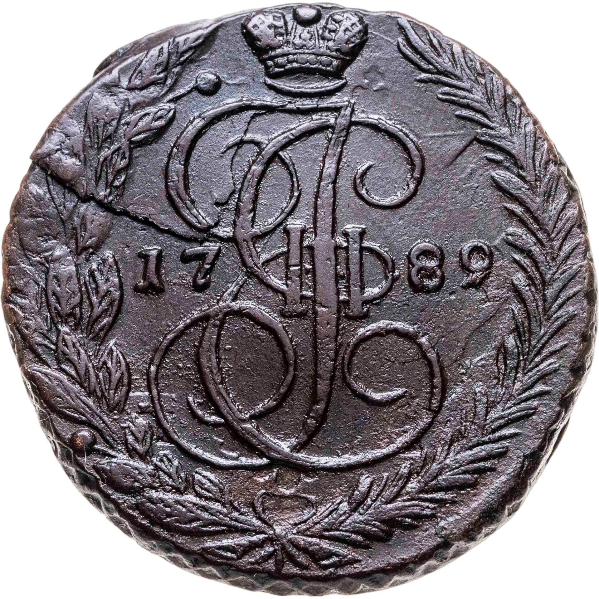 В центре изображён вензель Екатерины II. Над вензелем - императорская корона. По обеим сторонам от вензеля цифры даты выпуска монеты: слева - «17», справа - «89» (1789 год). Вокруг центрального изображения, вдоль канта, изображён венок из лавровой и пальмовой ветвей, которые, в нижней части, перевязаны лентой на узел бантом.