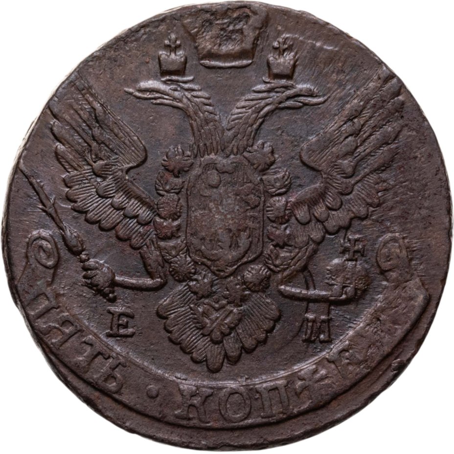 В центре изображен Государственный Герб Российской империи - двуглавый орёл с поднятыми вверх распущенными крыльями. Головы которого увенчаны двумя коронами, третья, большая корона над ними. На груди орла расположен Московский герб - щит с изображением Георгия Победоносца, поражающего копьём дракона. Вокруг щита орденская цепь с орденом Св. Апостола Андрея Первозванного. В правой лапе орла – скипетр, в левой – держава. Под правой лапой – буква «А», под левой – буква «М». Обозначение Аннинского монетного двора. Внизу, под центральным изображением, полукругом располагается бандероль с обозначением номинала - «ПЯТЬ•КОПѢЕКЪ».