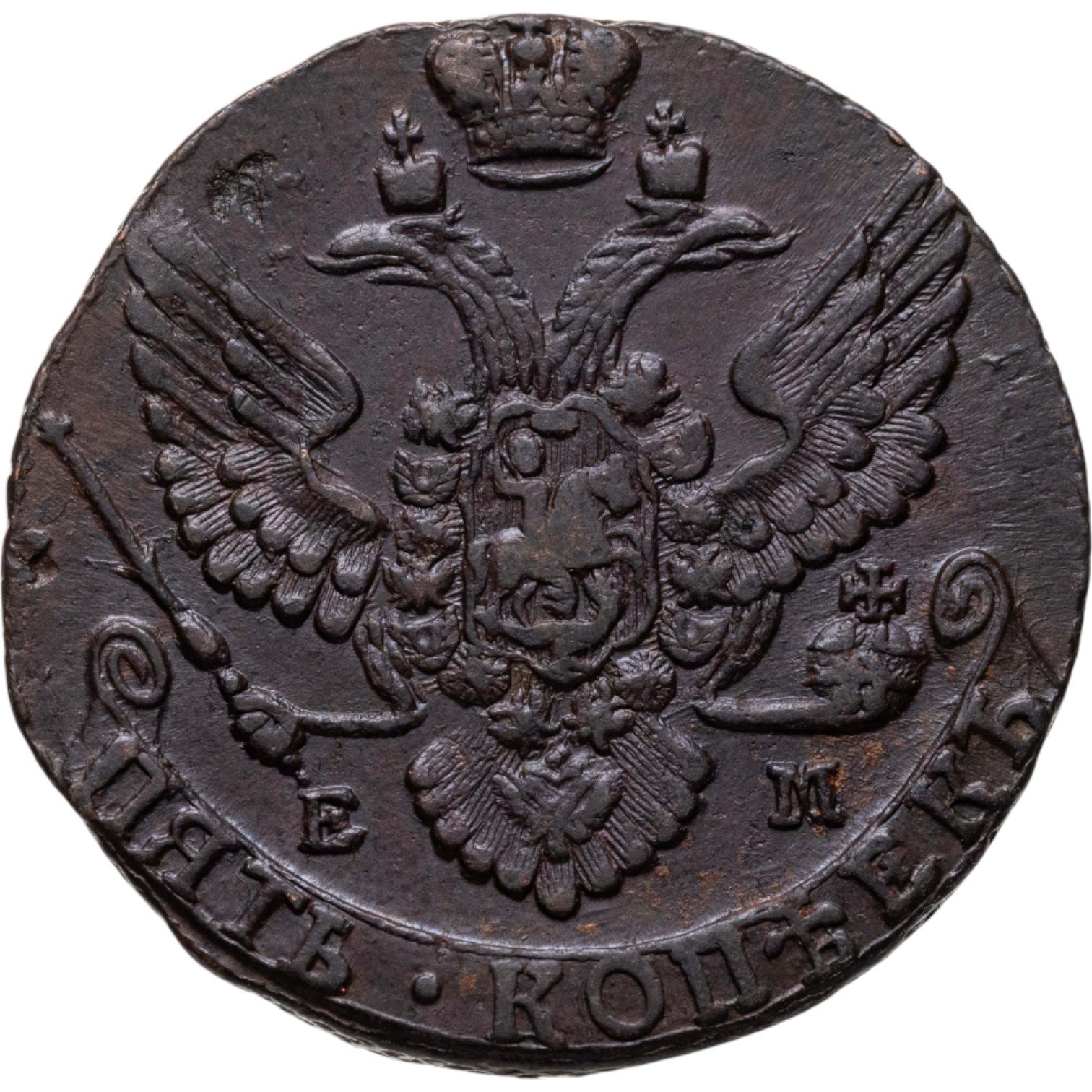 В центре изображен Государственный Герб Российской империи - двуглавый орёл с поднятыми вверх распущенными крыльями. Головы которого увенчаны двумя коронами, третья, большая корона над ними. На груди орла расположен Московский герб - щит с изображением Георгия Победоносца, поражающего копьём дракона. Вокруг щита орденская цепь с орденом Св. Апостола Андрея Первозванного. В правой лапе орла – скипетр, в левой – держава. Под правой лапой – буква «А», под левой – буква «М». Обозначение Аннинского монетного двора. Внизу, под центральным изображением, полукругом располагается бандероль с обозначением номинала - «ПЯТЬ•КОПѢЕКЪ».