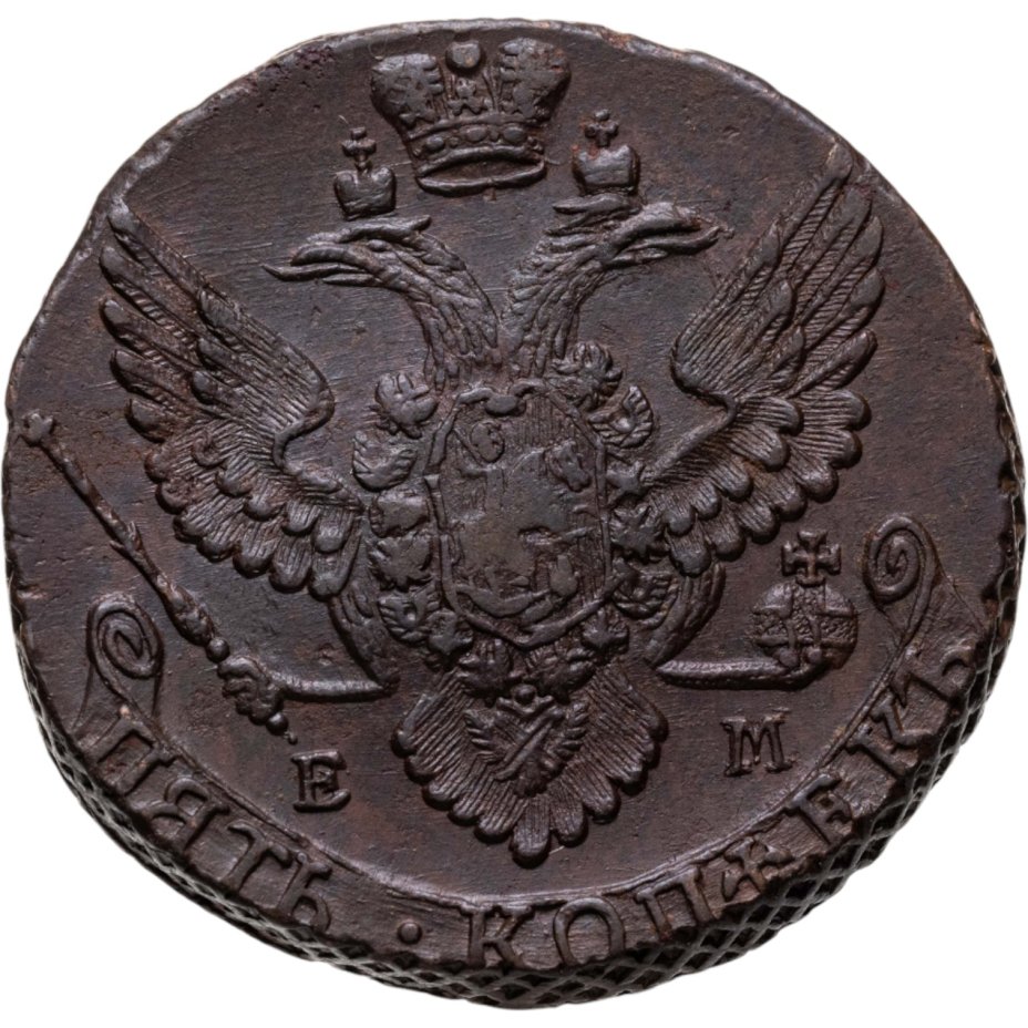 В центре изображен Государственный Герб Российской империи - двуглавый орёл с поднятыми вверх распущенными крыльями. Головы которого увенчаны двумя коронами, третья, большая корона над ними. На груди орла расположен Московский герб - щит с изображением Георгия Победоносца, поражающего копьём дракона. Вокруг щита орденская цепь с орденом Св. Апостола Андрея Первозванного. В правой лапе орла – скипетр, в левой – держава. Под правой лапой – буква «А», под левой – буква «М». Обозначение Аннинского монетного двора. Внизу, под центральным изображением, полукругом располагается бандероль с обозначением номинала - «ПЯТЬ•КОПѢЕКЪ».