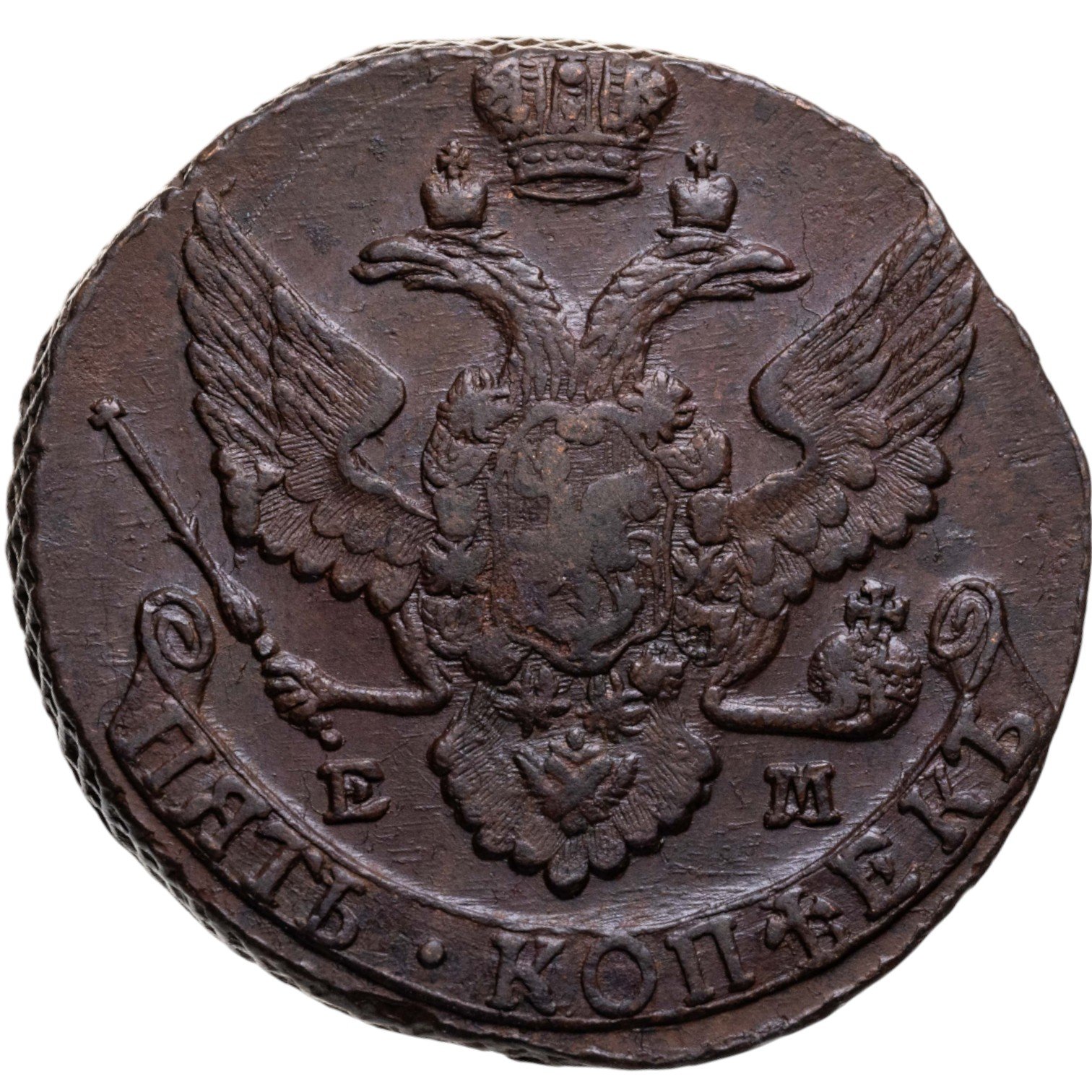 В центре изображен Государственный Герб Российской империи - двуглавый орёл с поднятыми вверх распущенными крыльями. Головы которого увенчаны двумя коронами, третья, большая корона над ними. На груди орла расположен Московский герб - щит с изображением Георгия Победоносца, поражающего копьём дракона. Вокруг щита орденская цепь с орденом Св. Апостола Андрея Первозванного. В правой лапе орла – скипетр, в левой – держава. Под правой лапой – буква «А», под левой – буква «М». Обозначение Аннинского монетного двора. Внизу, под центральным изображением, полукругом располагается бандероль с обозначением номинала - «ПЯТЬ•КОПѢЕКЪ».