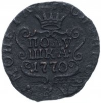 В центре изображен картуш с надписью в две строки: «ПОЛУ»│«ШКА•», под надписью дата выпуска - «1770». Над картушем - царская корона, над ней - четырёхлистная цветочная розетка. По окружности, вдоль канта, надпись: «•СИБИРСКАЯ•МОНЕТА•».