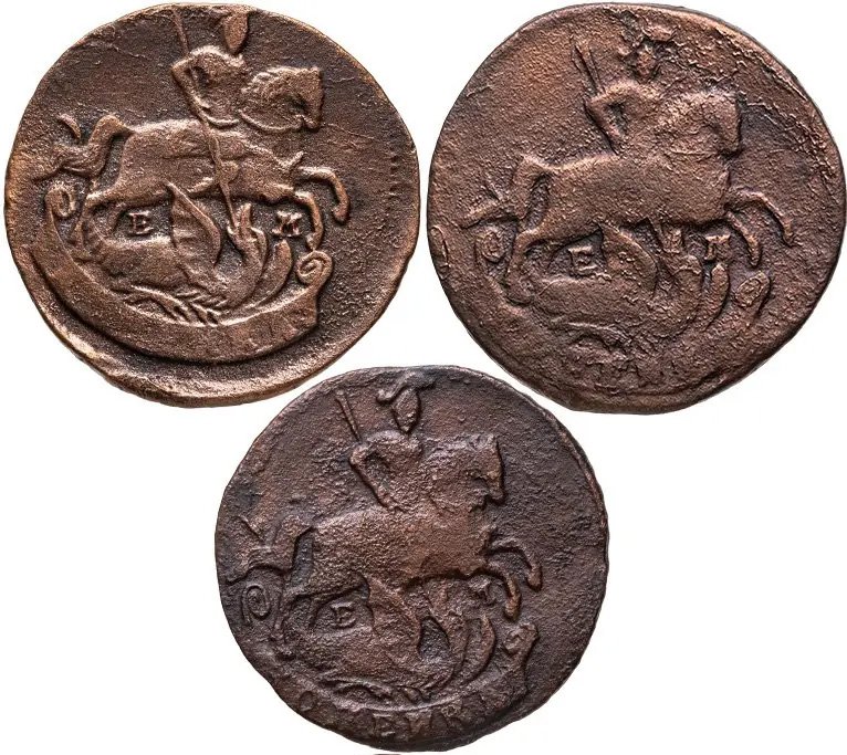 Медные копейки чеканятся сначала облегчённые: в 1762-1763 гг. они имеют стопу в 32 рубля. С 1763 года возвращаются к прежней стопе в 16 рублей, то есть становятся в два раза больше.