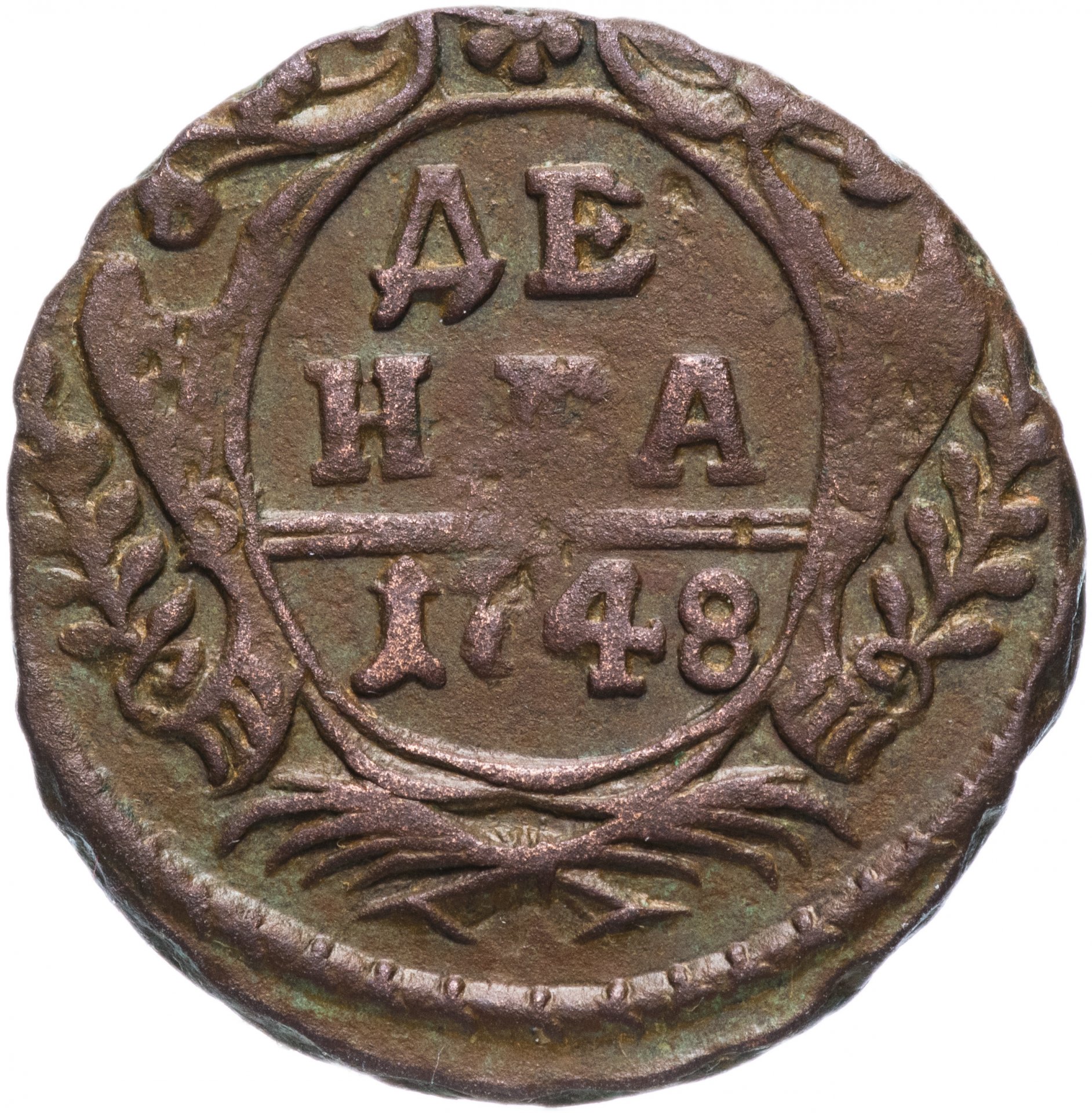 В центре изображён картуш украшенный виньетками, по обеим сторонам две лавровые ветви, сверху - цветочная розетка. Под картушем - две перекрещенные пальмовые ветви. В картуше надпись в три строки, в которой указан номинал и год выпуска: «ДЕ»│«НГА»│«1748». Между номиналом и годом выпуска две прямые черты.