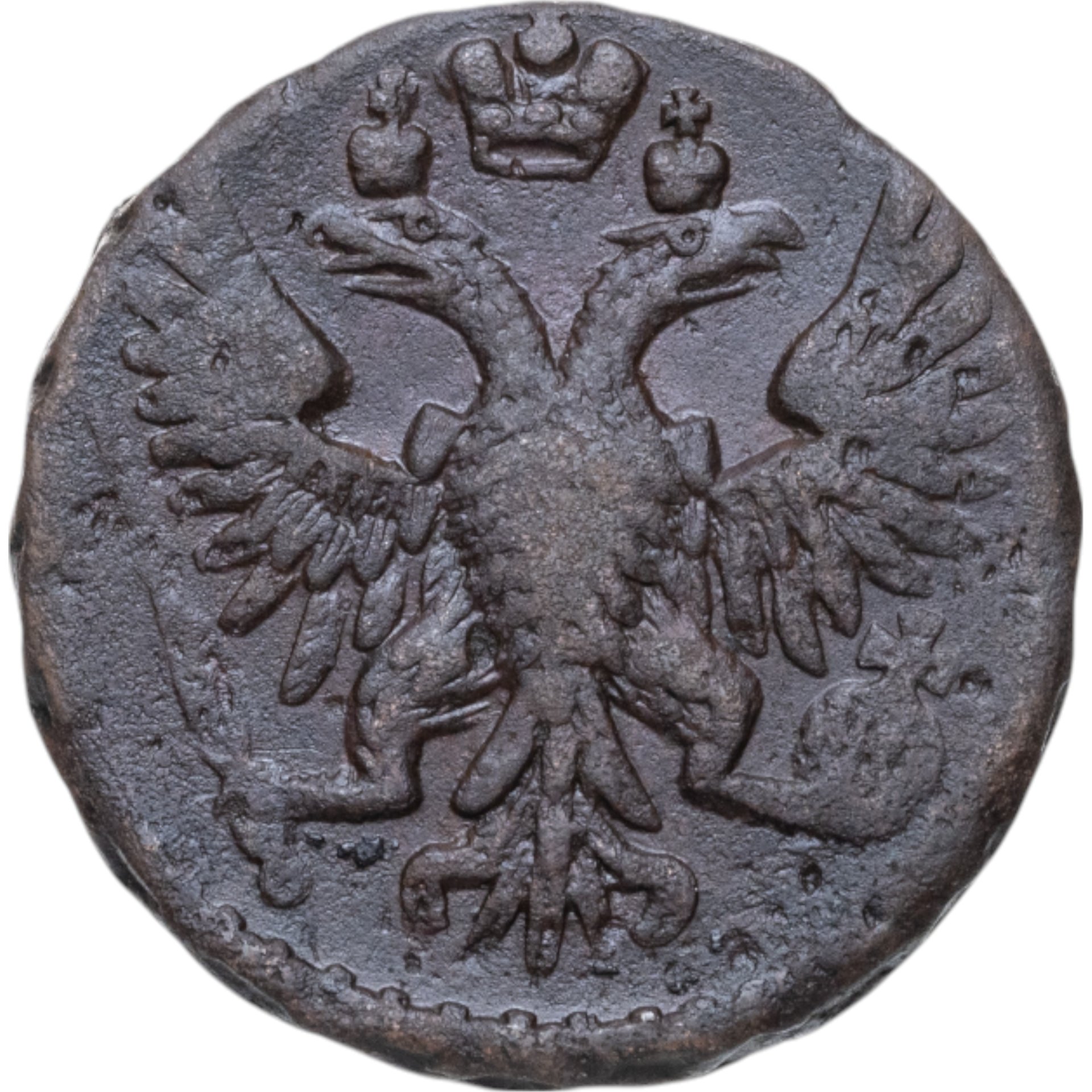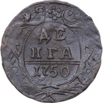 В центре изображён картуш украшенный виньетками, по обеим сторонам две лавровые ветви, сверху - цветочная розетка. Под картушем - две перекрещенные пальмовые ветви. В картуше надпись в три строки, в которой указан номинал и год выпуска: «ДЕ»│«НГА»│«1750». Между номиналом и годом выпуска две прямые черты.