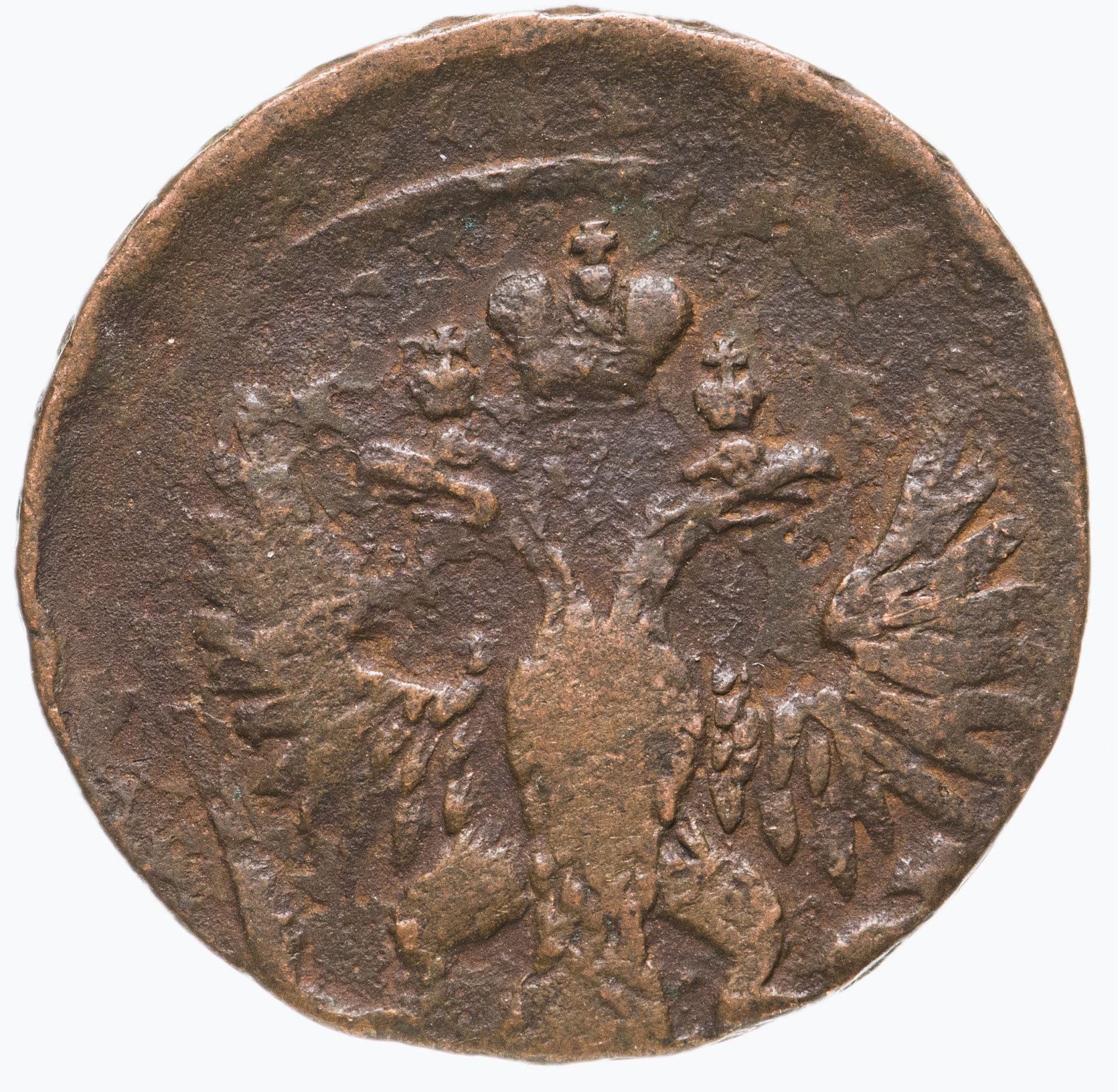 В центре изображен упрощённый Государственный Герб Российской империи - двуглавый орёл с поднятыми вверх распущенными крыльями. Головы которого увенчаны двумя коронами, третья, большая корона над ними. В правой лапе орла – скипетр, в левой – держава.