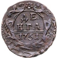 В центре изображён картуш украшенный виньетками, по обеим сторонам две лавровые ветви, сверху - цветочная розетка. Под картушем - две перекрещенные пальмовые ветви. В картуше надпись в три строки, в которой указан номинал и год выпуска: «ДЕ»│«НГА»│«1751». Между номиналом и годом выпуска две прямые черты.
