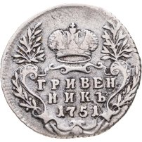 В центре изображен картуш с надписью в две строки: «ГРИВЕН»│«НИКЪ». Под надписью дата выпуска - «1751». Картуш венчает императорская корона. Картуш, слева и справа, украшен четырьмя стилизованными лавровыми ветвями.