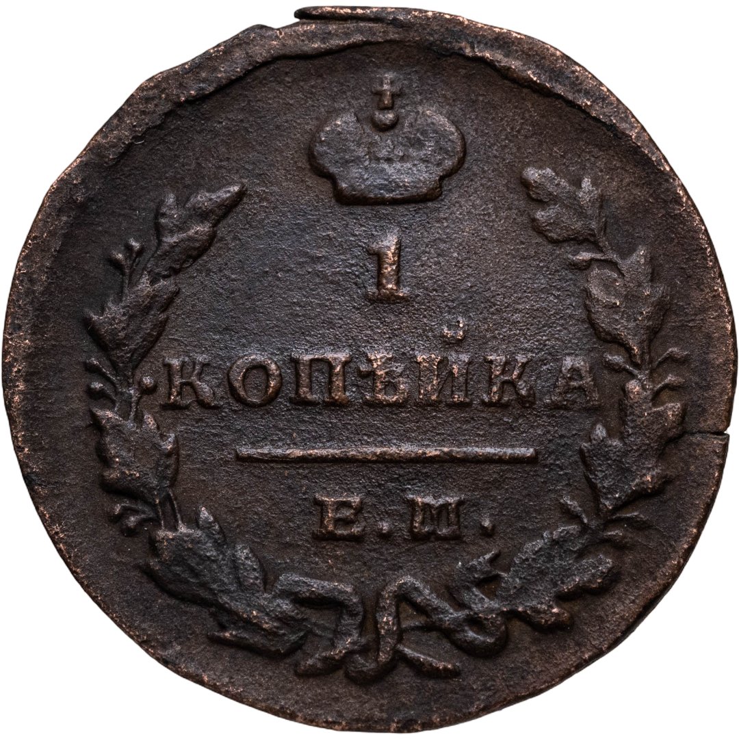В центре указан номинал - цифра «1». Над цифрой - императорская корона. Под цифрой номинала — надпись «КОПЕЙКА». Под надписью - прямая черта, под ней - обозначение монетного двора «Е.М.». Вдоль канта, не доходя до короны, изображен венок из лавровой и дубовой ветви, которые в нижней части переплетены лентой. По окружности канта имеются рельефные элементы, выполненные в виде точек.