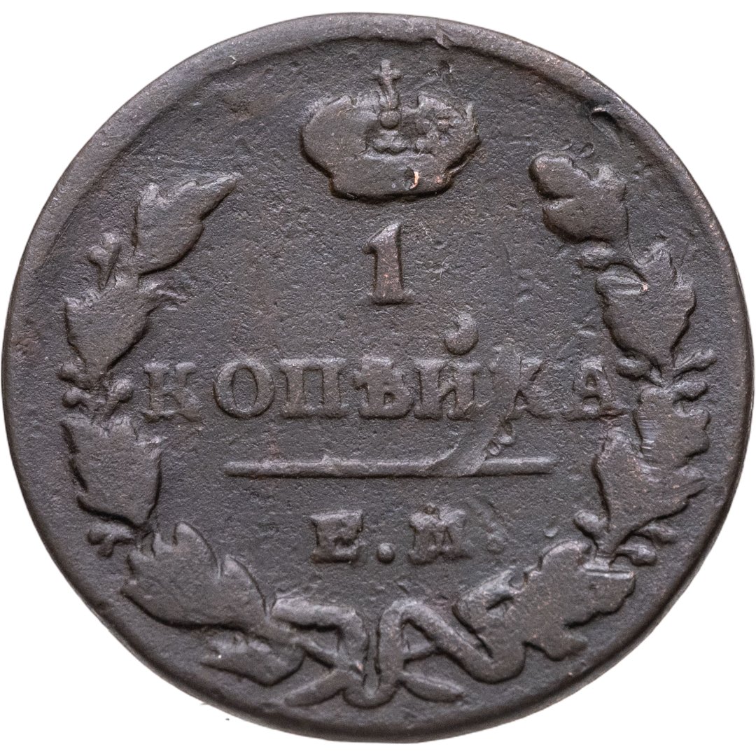 В центре указан номинал - цифра «1». Над цифрой - императорская корона. Под цифрой номинала — надпись «КОПЕЙКА». Под надписью - прямая черта, под ней - обозначение монетного двора «Е.М.». Вдоль канта, не доходя до короны, изображен венок из лавровой и дубовой ветви, которые в нижней части переплетены лентой. По окружности канта имеются рельефные элементы, выполненные в виде точек.