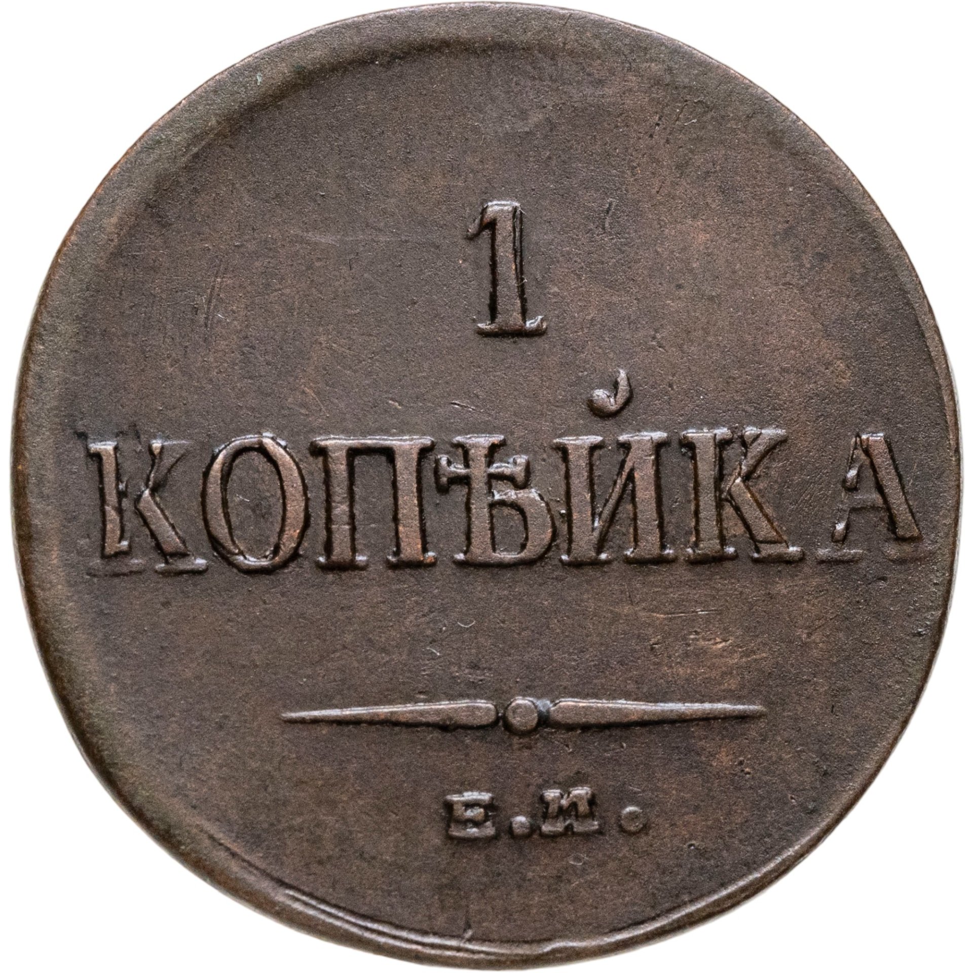 В центре указан номинал - «1». Под цифрой номинала — слово "КОПЕЙКА". Ниже, расположен декоративный разделитель в виде двух разнонаправленных линий и небольшой точки между ними. Ниже, под разделителем — обозначение монетного двора «Е.М.».