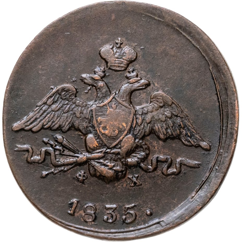 В центре изображен Государственный Герб Российской империи - двуглавый орёл с распростёртыми и опущенными вниз крыльями. Над головами орла - императорская корона. На груди орла расположен Московский герб - щит с изображением Георгия Победоносца, поражающего копьем дракона. Орёл держит, перевитые орденской лентой ордена Св. Апостола Андрея Первозванного, громовые стрелы и факел в правой лапе и лавровый венок — в левой. Под лентой буквы: слева «Ф», справа «Х». Инициалы минцмейстера Федора Хвощинского. Под инициалами — дата выпуска монеты «1835.»