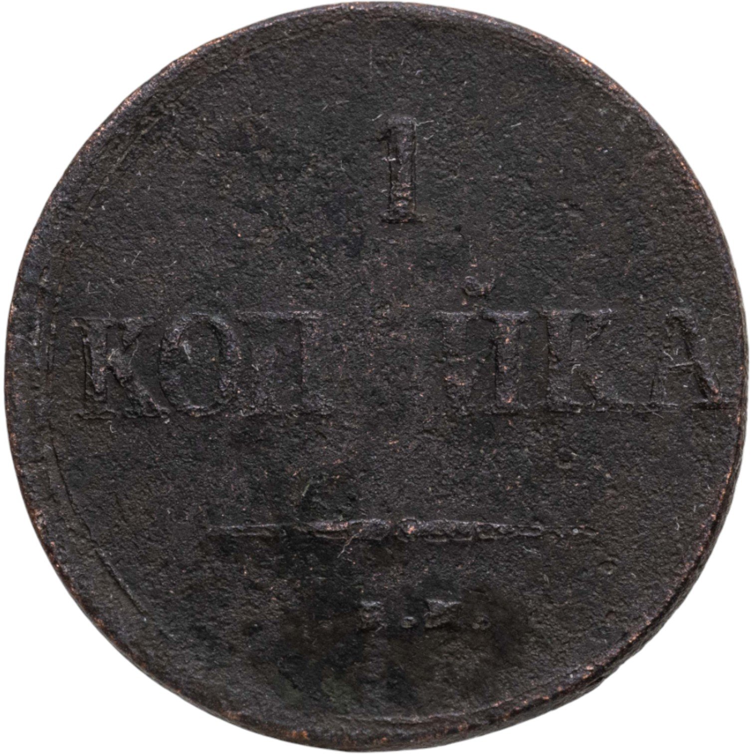 В центре указан номинал «1». Под цифрой номинала — слово "КОПЕЙКА". Ниже, расположен декоративный разделитель в виде двух разнонаправленных линий и небольшой точки между ними. Ниже, под разделителем — обозначение монетного двора «Е.М.».