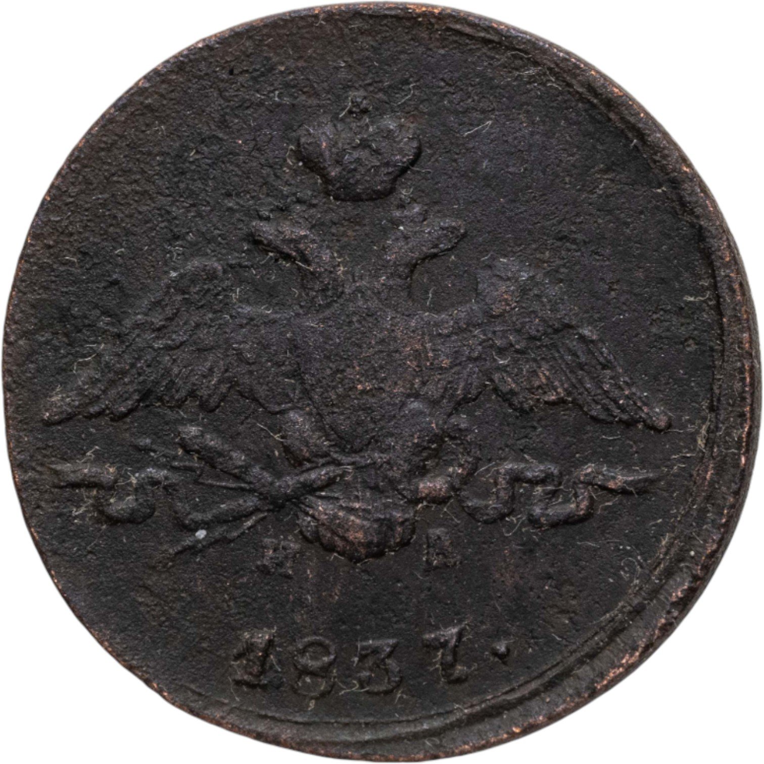 В центре изображен Государственный Герб Российской империи - двуглавый орёл с распростёртыми и опущенными вниз крыльями. Над головами орла - императорская корона. На груди орла расположен Московский герб - щит с изображением Георгия Победоносца, поражающего копьем дракона. Орёл держит, перевитые орденской лентой ордена Св. Апостола Андрея Первозванного, громовые стрелы и факел в правой лапе и лавровый венок — в левой. Под лентой буквы: слева «Н», справа «А». Инициалы минцмейстера Николая Алексеева. Под инициалами — дата выпуска монеты «1837.»