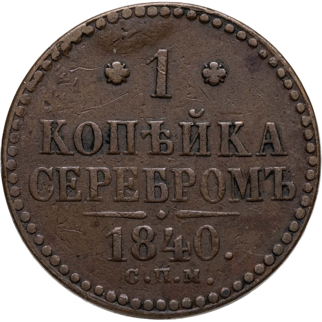 В центре надпись в две строки: «КОПѢЙКА»│«СЕРЕБРОМЪ». Над надписью обозначение номинала — цифра «1», ограниченная с обеих сторон цветочными розетками. Под надписью расположен декоративный разделитель в виде двух фигурных линий и небольшим прямоугольным ромбом между ними. Под разделителем — год выпуска монеты «1840.». Ниже, обозначение монетного двора — буквы «С.П.М.». По окружности канта имеются рельефные элементы, выполненные в виде точек.
