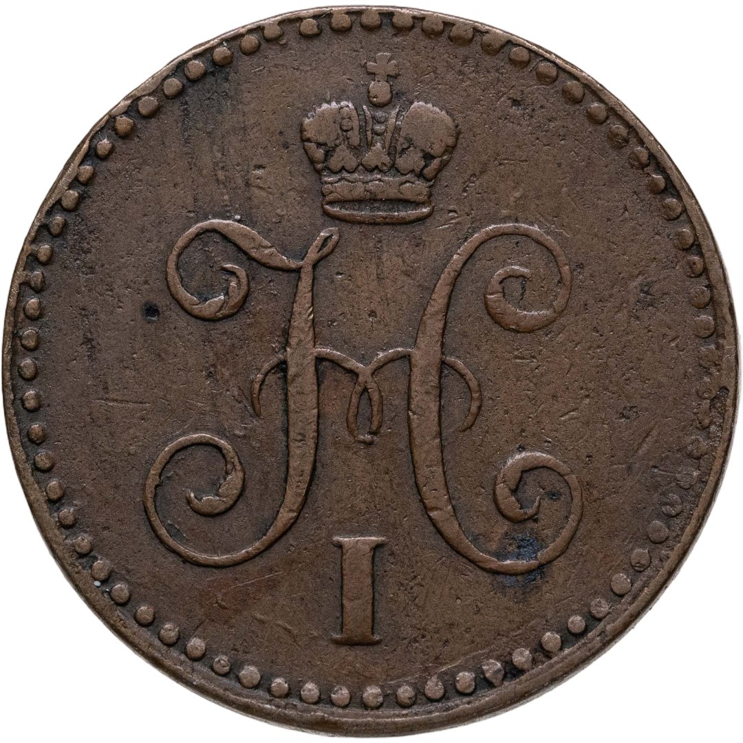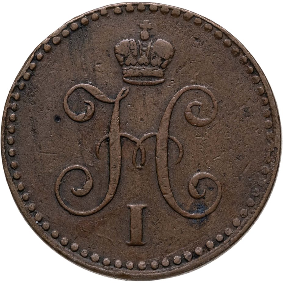 В центре вензель Николая I. Над ним Корона Российской империи. По окружности канта имеются рельефные элементы, выполненные в виде точек.