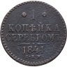 В центре надпись в две строки: «КОПѢЙКА»│«СЕРЕБРОМЪ». Над надписью обозначение номинала — цифра «1», ограниченная с обеих сторон цветочными розетками. Под надписью расположен декоративный разделитель в виде двух фигурных линий и небольшим прямоугольным ромбом между ними. Под разделителем — год выпуска монеты «1841.». Ниже, обозначение монетного двора — буквы «С.П.М.». По окружности канта имеются рельефные элементы, выполненные в виде точек.