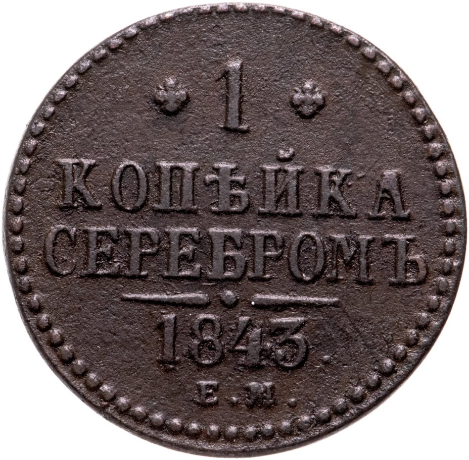 В центре надпись в две строки: «КОПѢЙКА»│«СЕРЕБРОМЪ». Над надписью обозначение номинала — цифра «1», ограниченная с обеих сторон цветочными розетками. Под надписью расположен декоративный разделитель в виде двух фигурных линий и небольшим прямоугольным ромбом между ними. Под разделителем — год выпуска монеты «1843.». Ниже, обозначение монетного двора — буквы «Е.М.». По окружности канта имеются рельефные элементы, выполненные в виде точек.