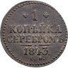 В центре надпись в две строки: «КОПѢЙКА»│«СЕРЕБРОМЪ». Над надписью обозначение номинала — цифра «1», ограниченная с обеих сторон цветочными розетками. Под надписью расположен декоративный разделитель в виде двух фигурных линий и небольшой точки между ними. Под разделителем — год выпуска монеты «1843.». Ниже, обозначение монетного двора — буквы «С.М.». По окружности канта имеются рельефные элементы, выполненные в виде точек.
