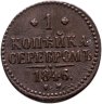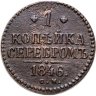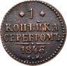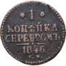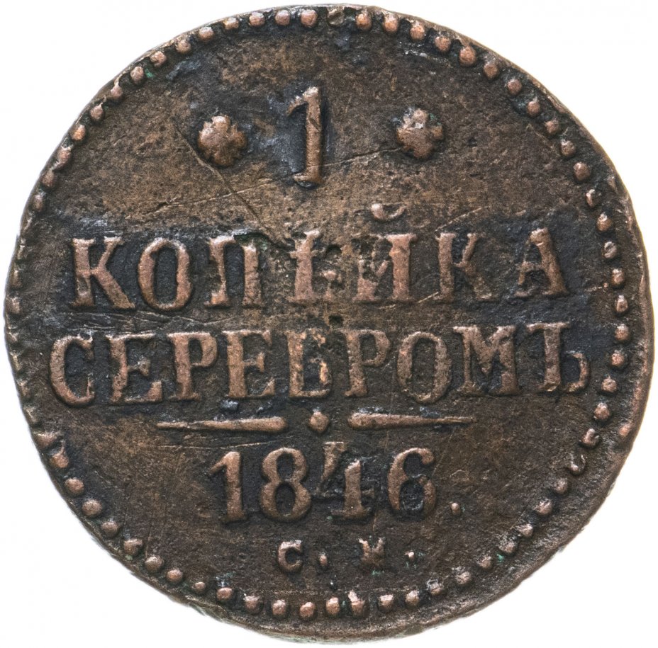 В центре надпись в две строки: «КОПѢЙКА»│«СЕРЕБРОМЪ». Над надписью обозначение номинала — цифра «1», ограниченная с обеих сторон цветочными розетками. Под надписью расположен декоративный разделитель в виде двух фигурных линий и небольшой точки между ними. Под разделителем — год выпуска монеты «1846.». Ниже, обозначение монетного двора — буквы «С.М.». По окружности канта имеются рельефные элементы, выполненные в виде точек.