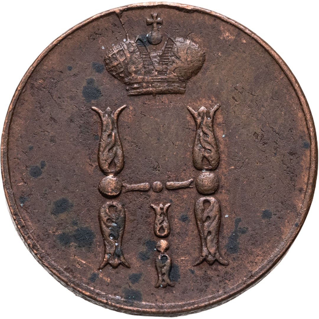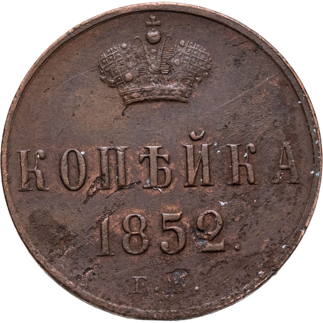 В центе обозначение номинала — слово «КОПЕЙКА». Выше номинала - Корона Российской империи. Ниже номинала — год выпуска монеты «1852.» и под годом - обозначение монетного двора буквы «Е.М.».