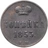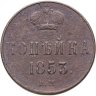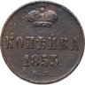В центе обозначение номинала — слово «КОПЕЙКА». Выше номинала - Корона Российской империи. Ниже номинала — год выпуска монеты «1853.» и под годом - обозначение монетного двора буквы «Е.М.».