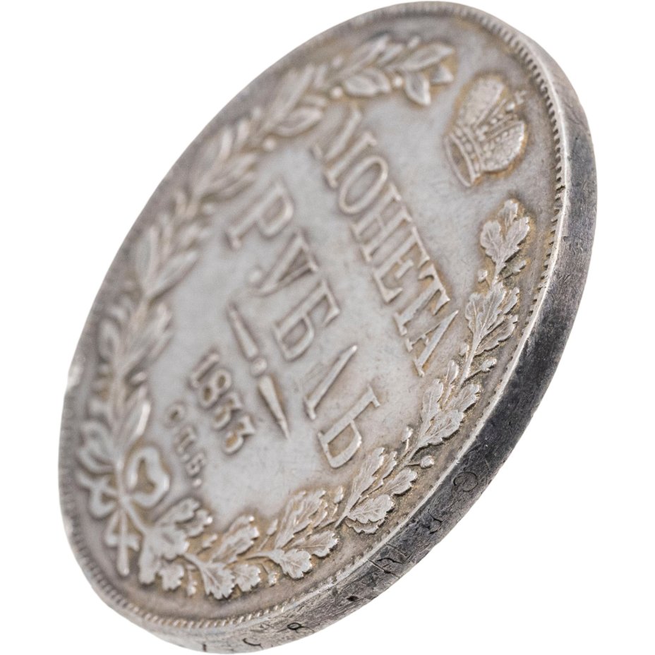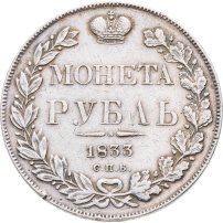 В центре указан номинал «МОНЕТА РУБЛЬ» в две строки. Над номиналом – Корона Российской империи. Под номиналом расположен декоративный разделитель в виде двух разнонаправленных фигурных линий и небольшой окружности между ними, в центре которой, выпуклая точка. Под разделителем — дата выпуска монеты «1833». Под цифрой даты — обозначение монетного двора «С.П.Б.». Вдоль канта, не доходя до короны, изображен венок из лавровой и дубовой ветви, которые в нижней части перевязаны лентой на узел бантом. По окружности канта имеются рельефные элементы, выполненные в виде зубцов.