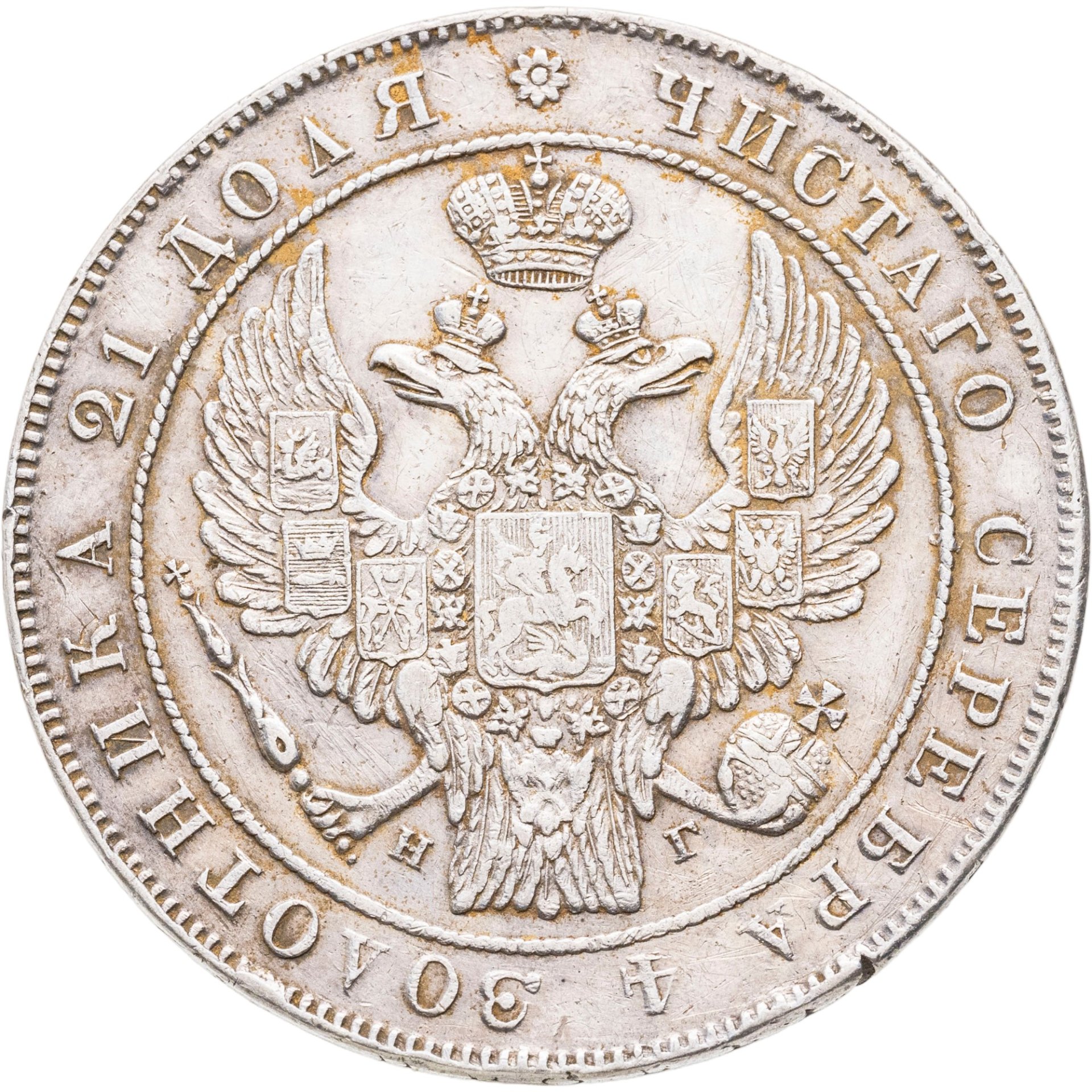 В центре изображен Государственный Герб Российской империи - двуглавый орёл, головы которого увенчаны двумя коронами, третья, большая корона над ними. На груди орла расположен Московский герб - щит с изображением Георгия Победоносца, поражающего копьем дракона. Вокруг щита орденская цепь с орденом Св. Апостола Андрея Первозванного. На крыльях изображены титульные гербы: на правом — Казанский, Астраханский и Сибирский, на левом — Польский, Таврический и Финляндский. В правой лапе орла – скипетр, в левой – держава. Под правой лапой – буква «Н», под левой – буква «Г». Инициалы минцмейстера Николая Грачева. Центральная часть отделена от остального изображения, окружностью в виде точек. За окружностью круговая надпись: «ЧИСТОГО СЕРЕБРА 4 ЗОЛОТНИКА 21 ДОЛЯ», разделенная сверху цветочной розеткой. По окружности канта имеются рельефные элементы, выполненные в виде зубцов.